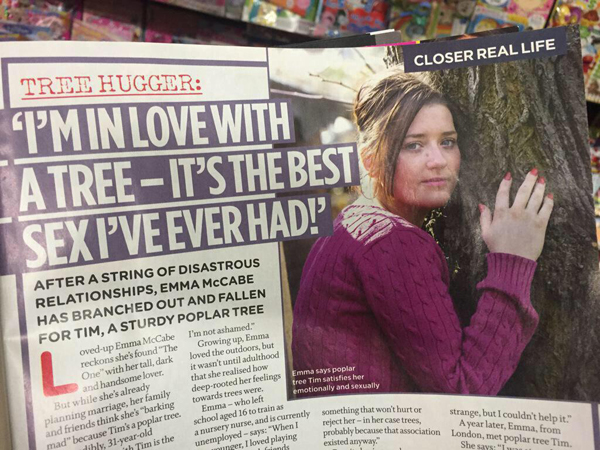 "Meet loved-up Emma McCabe, 31, who’s given up on men and enjoying steamy sex sessions with a poplar tree called Tim!" the site gleefully declares.